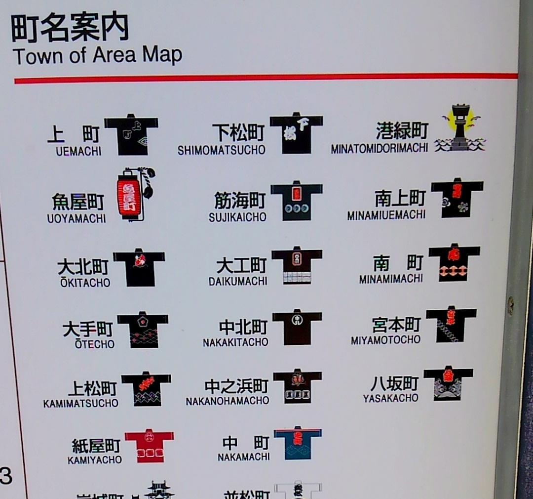 Some neat things about the festival: Multiple towns (I suppose now they are more like neighborhoods) take part and they each have their own danjiri and their own signature happi jackets AND t-shirts. Many of the towns had pretty simple kanji that I was able to read, which became an amusing activity throughout the day.