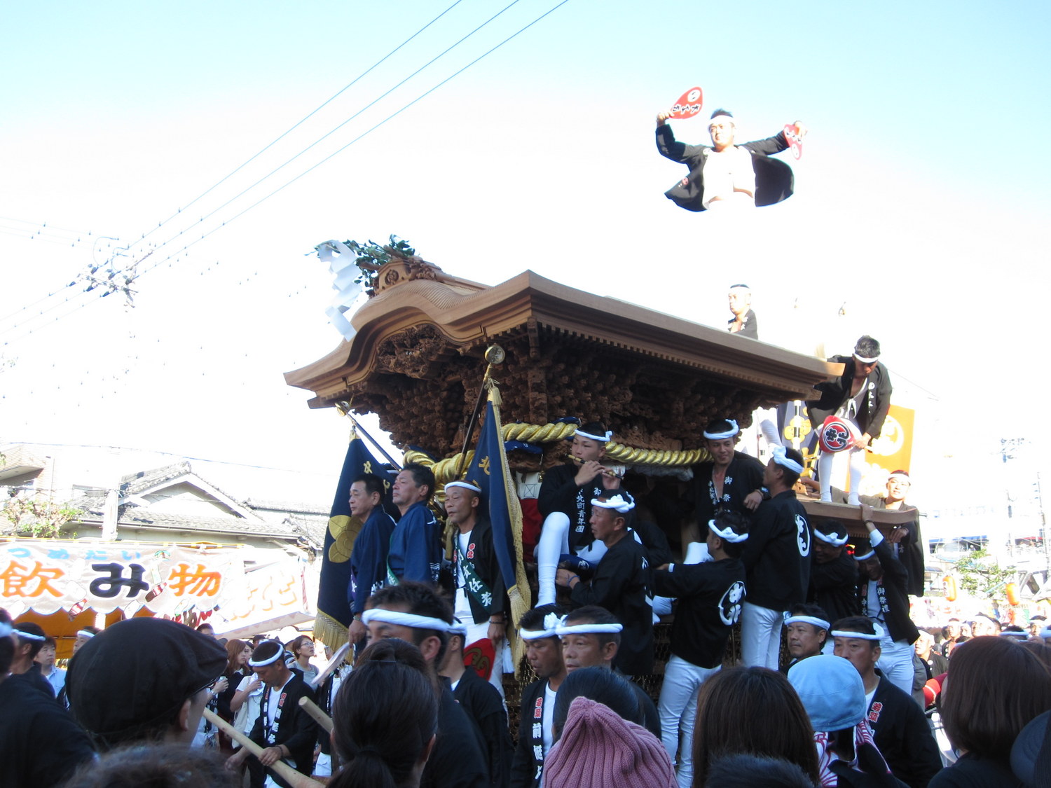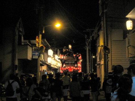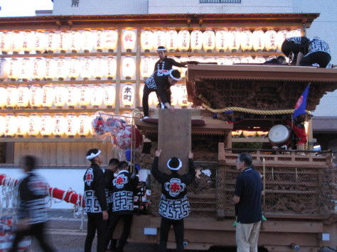 A danjiri apparently weighs a couple tons. And it probably weighs more with a musical group sitting inside and a man dancing on the top, so it requires all the young and strong people in the town to pull it. All day. Racing through the streets.