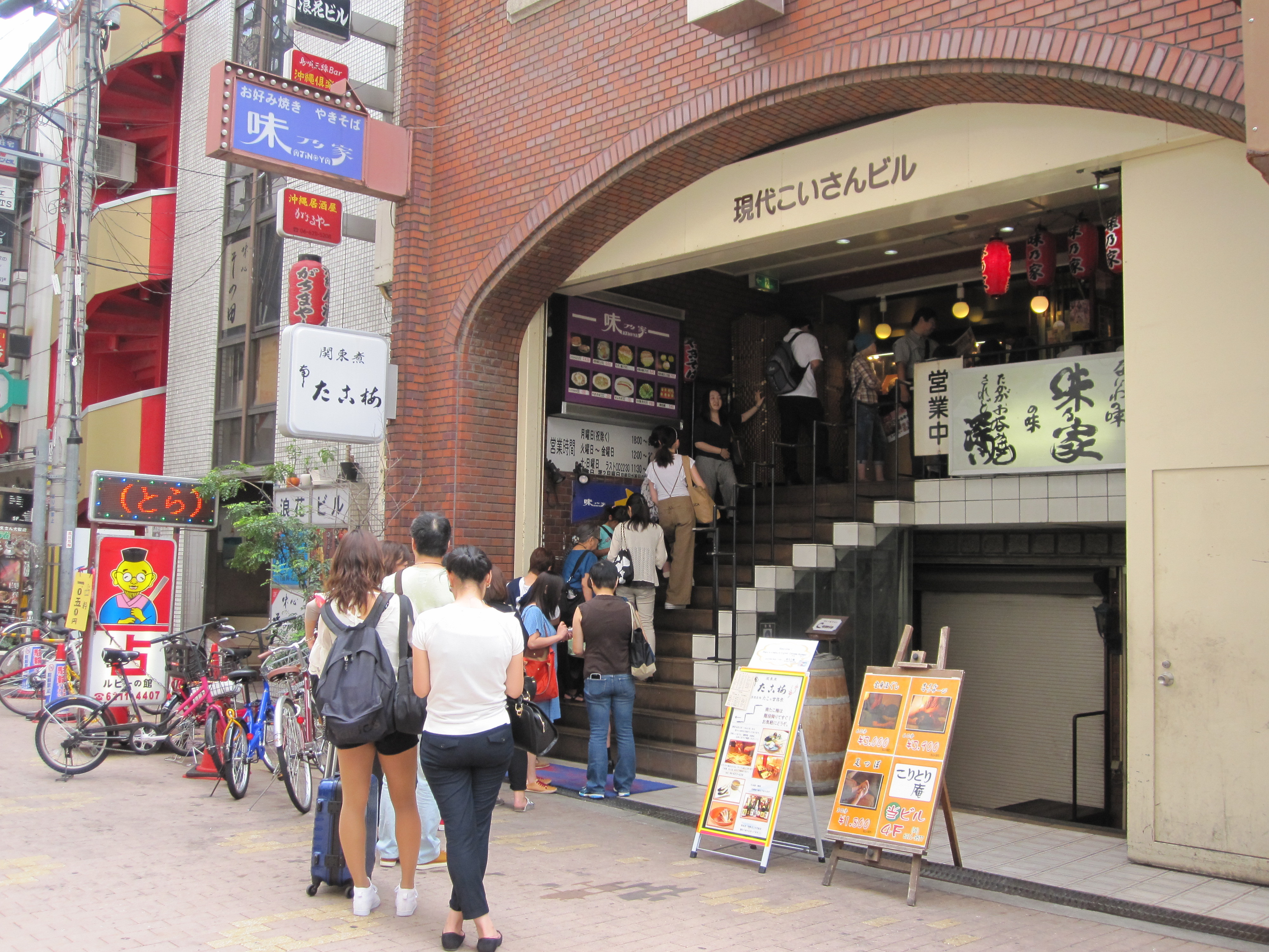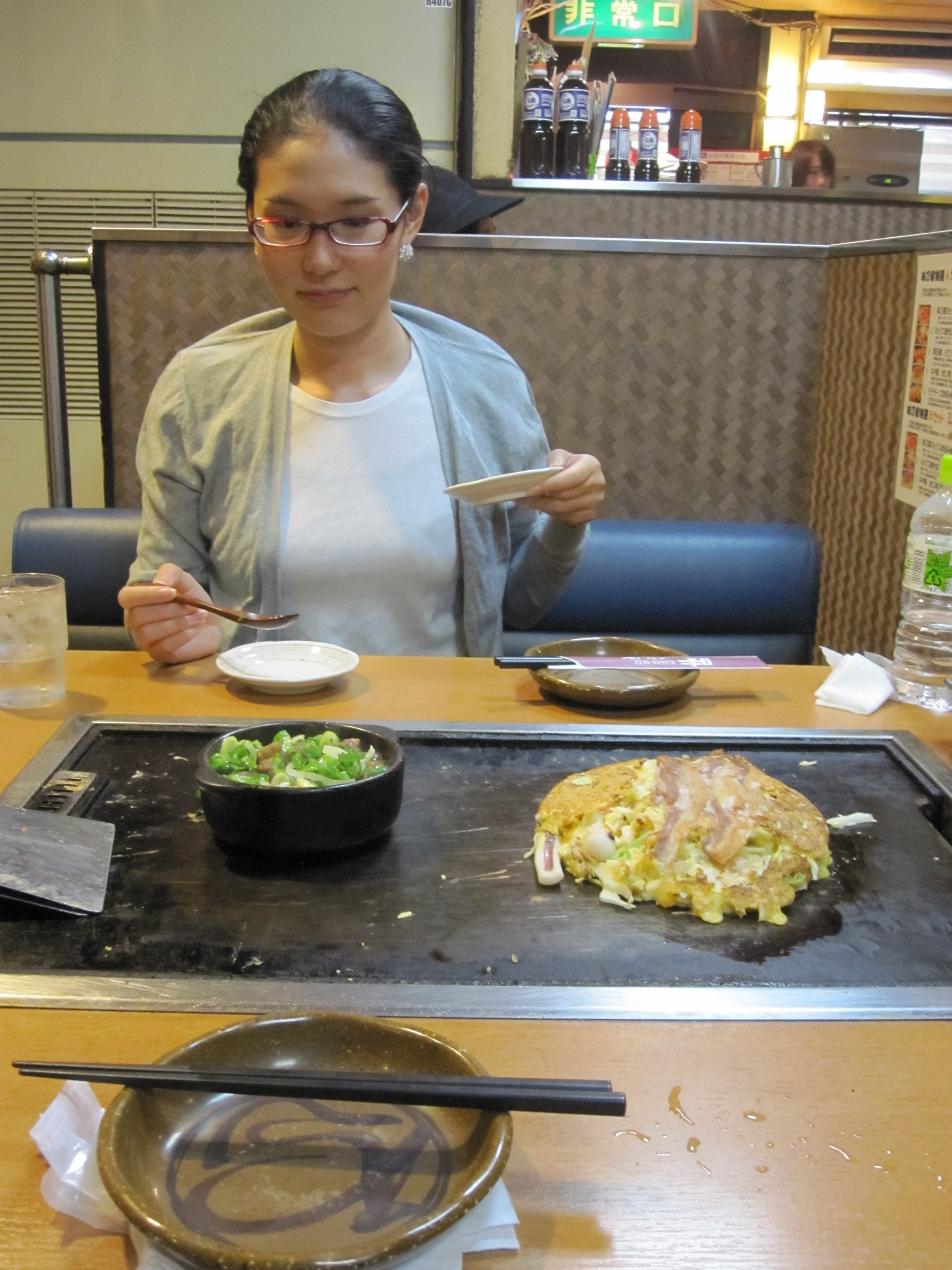 For lunch we went to Ajinoya for Okonomiyaka. There was a serious line but in the end we were able to enjoy the finest of okonomiyaki. In Sachi’s words, the restaurant “isn’t very clean” — it definitely hasn’t been remodelled since the 1970s and all decorations consist of cheap posters of beer– but it is possibly the best okonomiyaki place in Osaka.