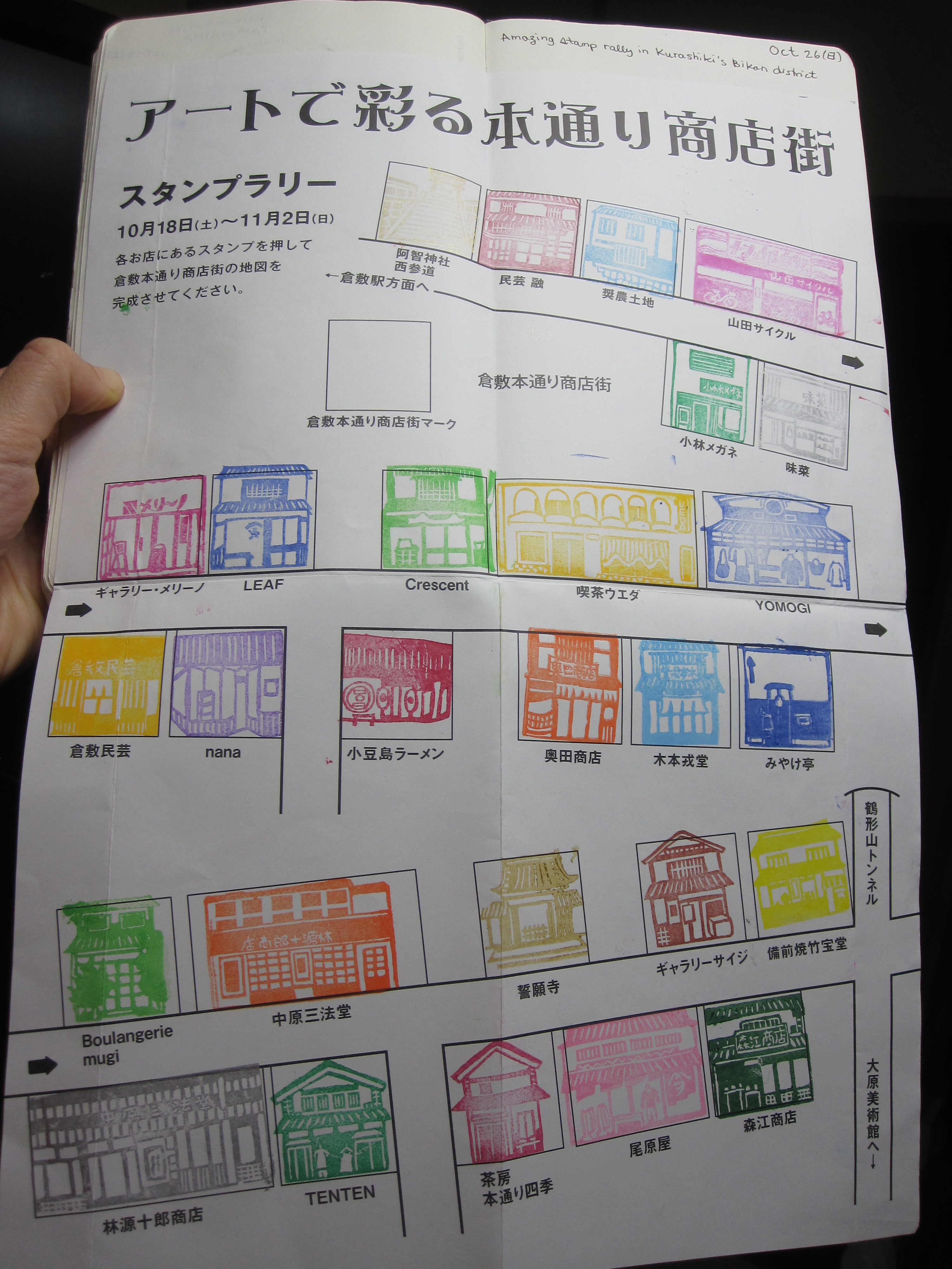Let me explain with this example of the coolest stamp rally I’ve seen yet. It was on a street in Kurashiki’s historical Bikan area. Almost every shop on this street had a stamp that was handcarved to look like the actual shop. There was a variety of brightly coloured ink, and the rally paper was arranged to look like a linear map of the street.