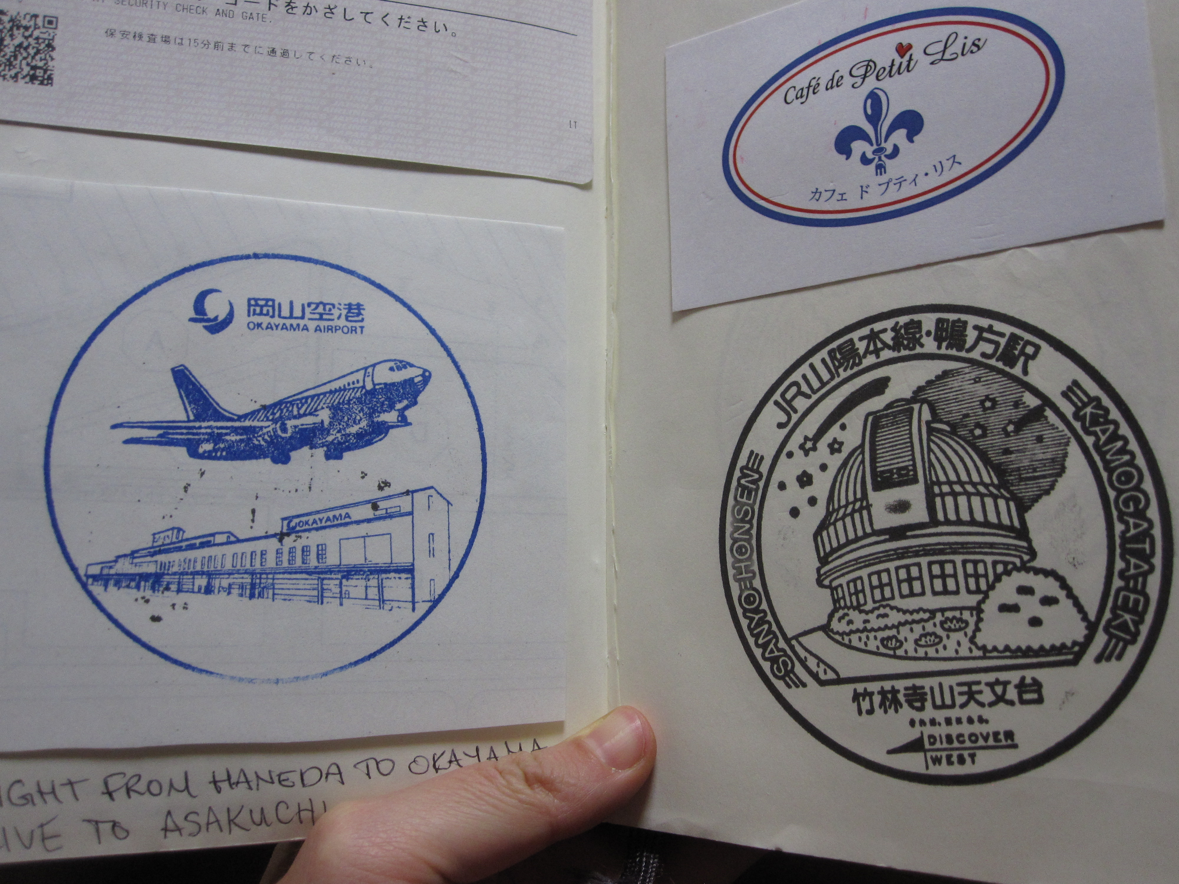 Welcome home: Okayama airport stamp and Kamogata station. Yes, we have a big astronomical observatory, in case you couldn’t guess. We can also see so many bright stars!
