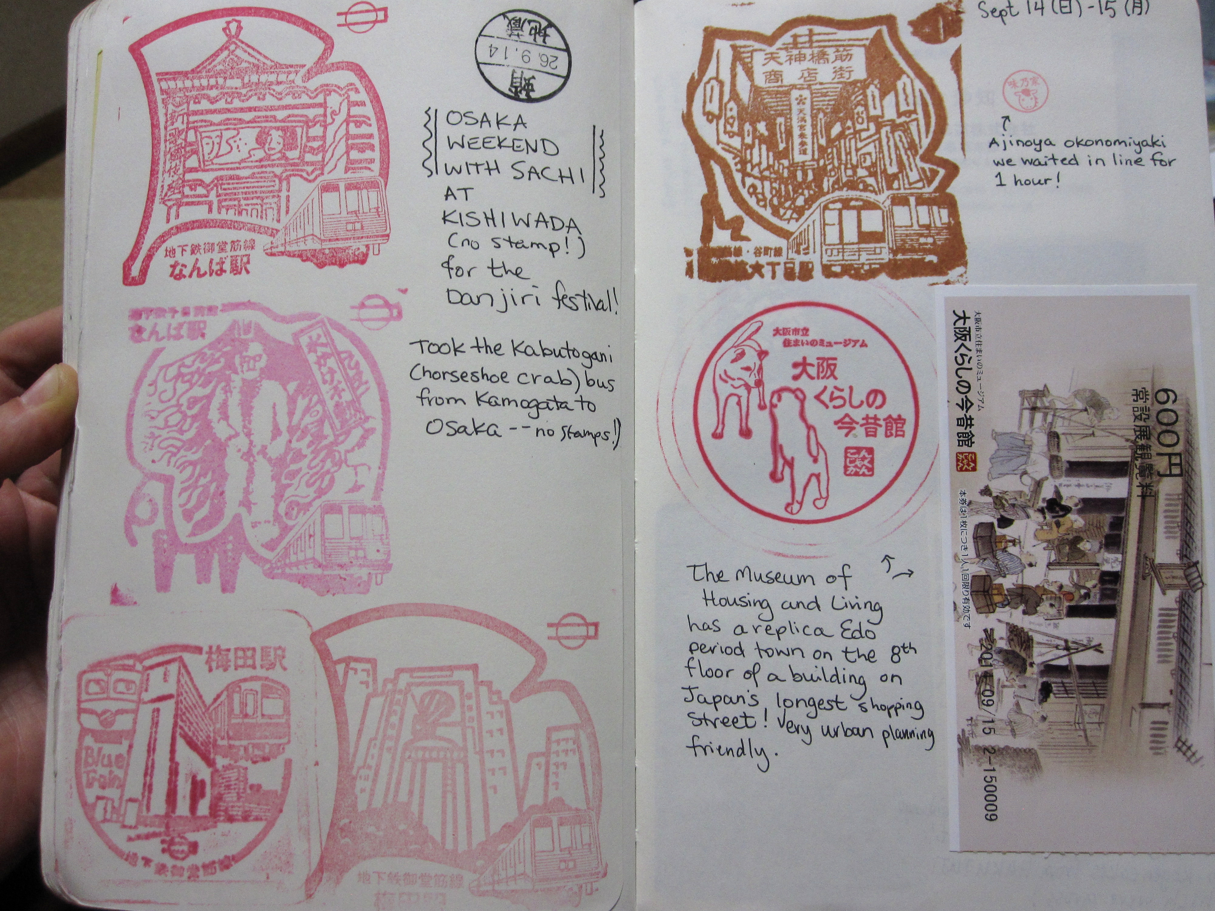 This page shows my stamp book from a trip to osaka this year.  The Osaka rail system is color coded, and they try to coordinate the ink of their station stamps with the line. So you can see a red line, a pink line and a brown line stamp. the circular stamp with the dogs is from the Museum of Housing and Living (ticket on the right).