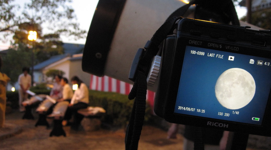 Recently I attended some classic Japanese events. Both involved looking at things in the night sky. Hanabi taikai is a fireworks festival, and tsukimi is a moon viewing. Although I was aware of these activities as part of Japanese culture, actually attending them has given me a better appreciation for culture as a practice. Even though in Canada there may be events that at first seem similar, the social meaning seems different. Unfortunately I can’t tell if I am just exoticizing the culture so that I see only differences. So I will be more descriptive and let you judge for yourself.